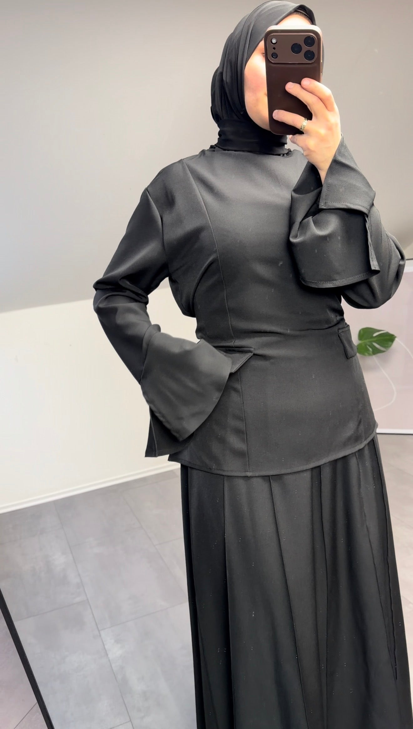 Modernes Maxikleid in zeitlosem Schwarz mit figurbetontem Taillenschnitt und stilvollen ausgestellten Ärmeln. Der fließende Rock sorgt für eine feminine Silhouette, während das hochgeschlossene Design dem Look eine edle und minimalistische Note verleiht.